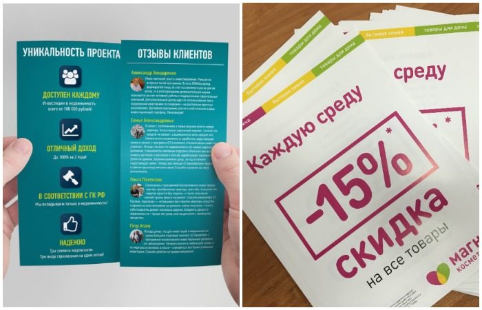 У листовки информационный характер. Она рассказывает о компании, ее услугах, рекламирует товары, их преимущества, дает справочную информацию. Акцент здесь делается именно на текст. Флаер рассчитан на рекламу каких-либо событий или мероприятий. Главное в нем — привлекательный дизайн, который заинтересует людей. Часто флаеры используют как пригласительные, билеты, печатают на них скидки и бонусы.