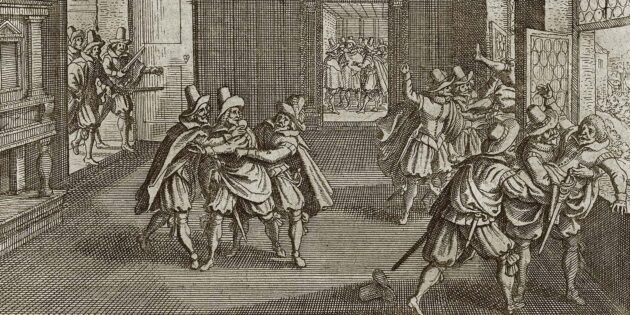 Вторая пражская дефенестрация. Иоганн Филипп Абелинус, гравюра на дереве, 1618 г.