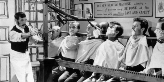 Вот только на самом деле эта картинка — кадр из малоизвестного сериала «Мозговые волны» 1960 года, главную роль в котором исполнил британский комик Эрик Сайкс. А машина — просто реквизит, и на самом деле брить людей она не могла.