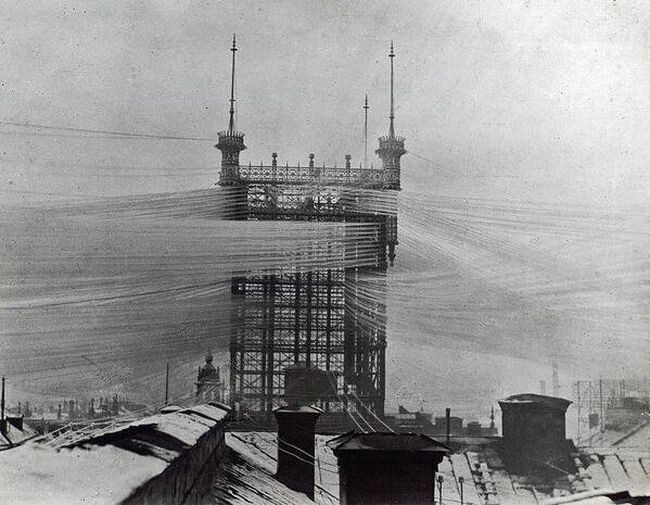 13. Телефонная башня в Стокгольме до того, как шведы разобрались с проводами: на фото 5000 линий,1890 год.