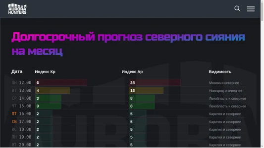 При индексе Kp=5 уже можно посматривать на небо, если вы оказались за городом и небо ясное.Для этого существуют специальные сайты, такие как AuroraLights. Можно следить и с мобильного гаджета с помощью одного из следующих приложений – «Мой прогноз северного сияния», Hello Aurora и AuroraReach.