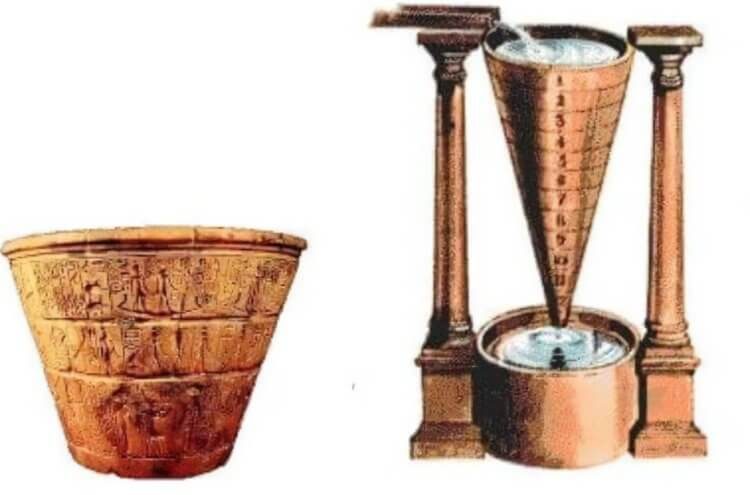 Днем солнца нет, поэтому египтяне использовали водяные часы, также известные как клепсидры. В водяных часах жидкость вытекает из одного сосуда в другой с определенной скоростью, либо с постоянной скоростью накапливается только в одном сосуде. Измерив объем вытекшей воды можно определить прошедшее время.