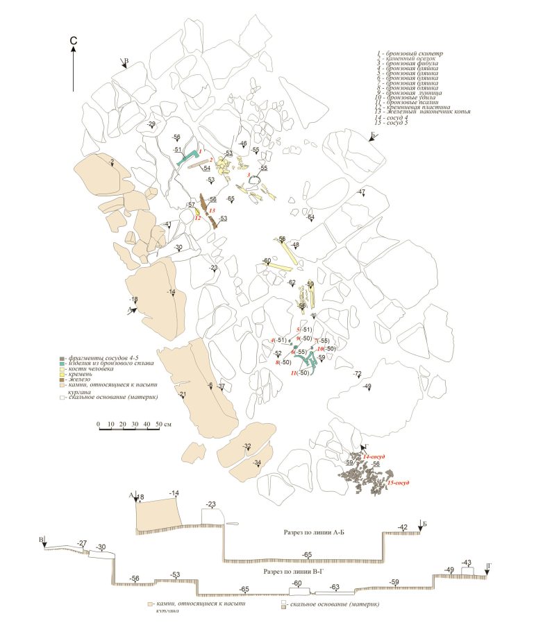 В могиле также нашли бронзовый топор-скипетр, железный наконечник копья, уздечный набор, бронзовую фибулу, оселок, кремневую пластину, а также две лепных корчаги. У восточного края могилы лежали останки лошади, её тушу при погребении разделили на две части. Судя по следам на зубах, лошадь была ездовой или тягловой.