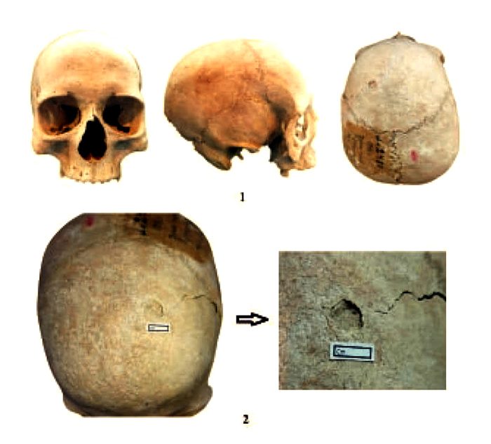 Погребённой было 20–30 лет. Следы травмы обнаружены на верхней части лобной кости черепа, слева. Это вдавленный компрессионный перелом диаметром 0,9 см, от которого отходят трещины. Следов заживления или воспалительного процесса нет, а значит, от этой травмы женщина, скорее всего, и умерла.