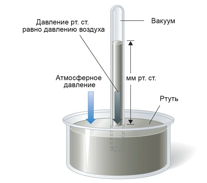 У нас есть стеклянная трубка — она запаяна сверху и наполнена ртутью. Открытым концом она опускается в чашу, которая тоже наполнена ртутью. Колебания атмосферного давления заставляют ртуть подниматься или опускаться до определенных отметок. Это и есть те самые миллиметры ртутного столба — та высота, до которой смогла доползти ртуть в трубке.