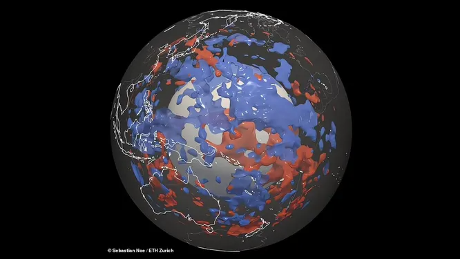 Синяя зона в западной части Тихого океана (прямо над центром изображения) ранее была неизвестнаSebastian Noe / ETH Zurich
