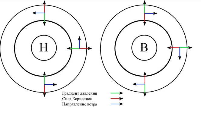 Это явление заставляет ветровые системы закручиваться в Северном полушарии против часовой стрелки, а в Южном полушарии.Эффект Кориолиса объясняет перемещение некоторых ветров вдоль краев зон высокого и низкого давления. Эти ветры называются геострофическими. В 1857 году голландский метеоролог Кристоф Байс Баллот сформулировал закон о геострофических ветрах: если вы стоите спиной к ветру в Северном полушарии, то область низкого давления всегда будет слева от вас. В Южном полушарии области низкого давления будут от вас справа.