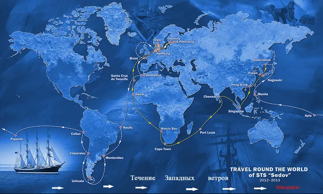 Маршрут кругосветного плавания барка «Седов» — крупнейшего в мире парусного судна, успешно преодолевшего «ревущие сороковые» в 2012 году