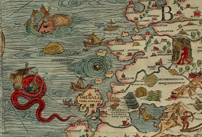 Водоворот около Норвегии на Портовой карте Олафа Магнуса, 1539 год.