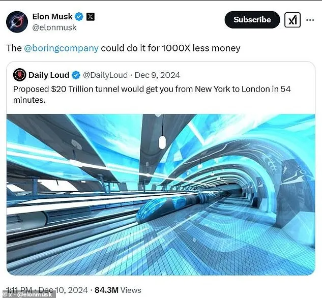 В декабре 2024 года Маск возродил интерес к этой идее после того, как заявил, что его компания может завершить трансатлантический туннель за «1000 раз меньше денег»