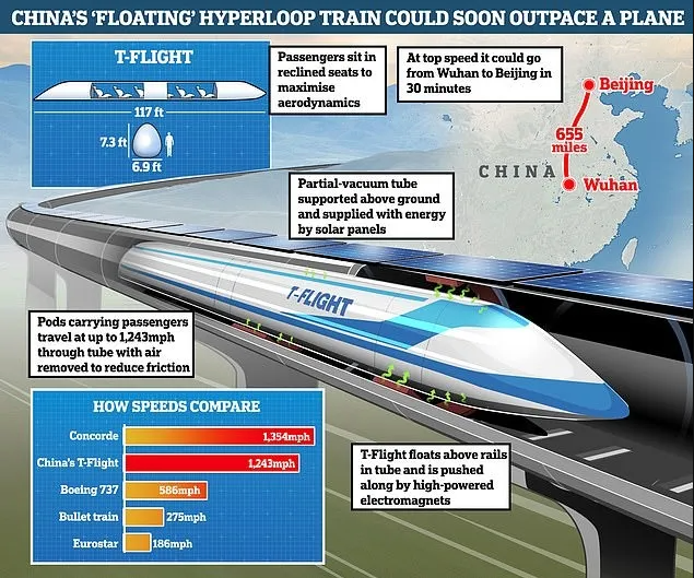 Экспериментальные поезда в Китае могут использовать ту же технологию «Hyperloop» для соединения Пекина и Ухана. Теоретическая максимальная скорость может составить 1243 мили в час (2000 км / ч)