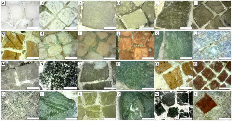 Цвет и структура позволяют сделать предположения о том, откуда привезли камни. Часть белых фрагментов мозаики представляет собой кусочки мрамора из Апуанских Альп, причём он добывался только в период с I в. до н.э. до III в. н.э. Тёмно-розовые тессеры, скорее всего, происходят с территории Португалии, жёлтые – из римского города Чемту (современный Тунис), а тёмно-красные – с мыса Матапан (крайняя южная точка материковой Греции).