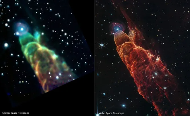 В этом сравнении показано изображение HH 49/50, полученное камерой инфракрасного диапазона космического телескопа Спитцер (слева), и изображение того же объекта, полученное Уэббом (справа).
