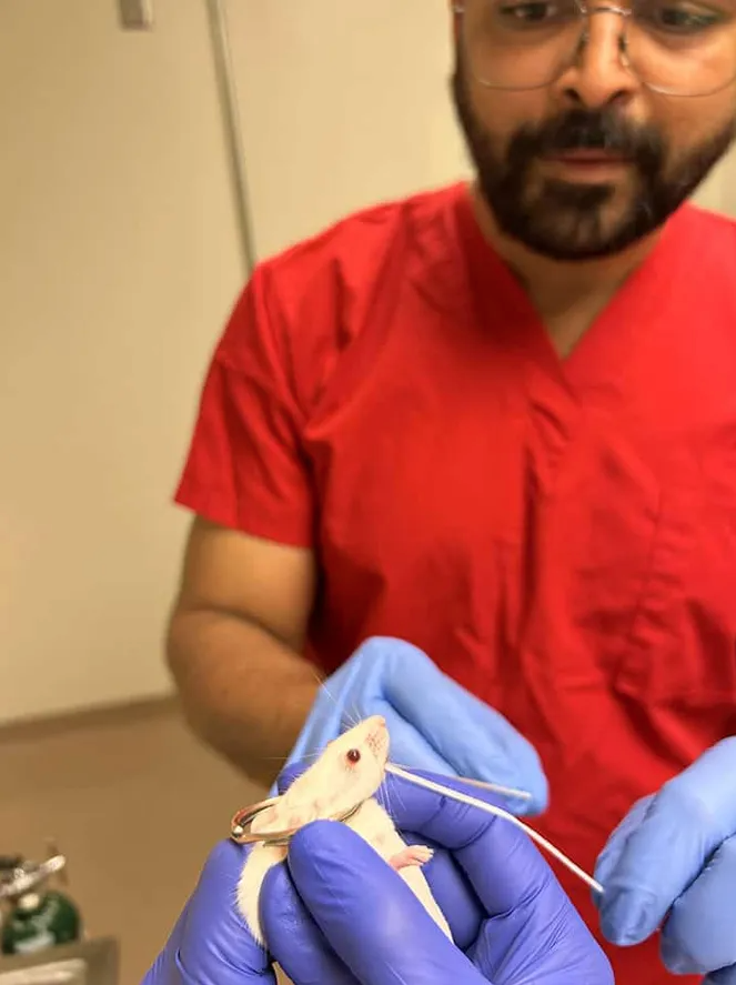 Рохан Ингрол чистит ротовую полость мыши зубной нитью, в то время как его коллега осторожно удерживает ее челюсть кольцом от брелка