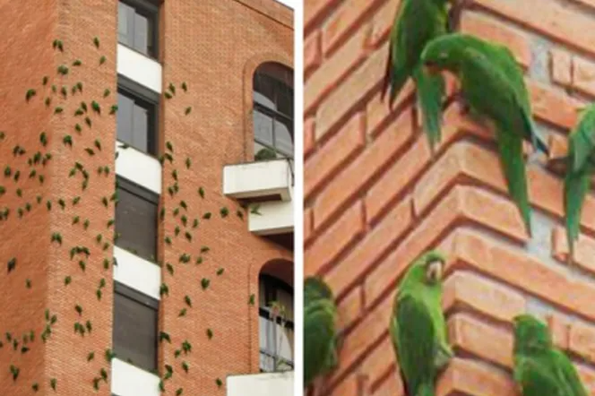 В Бразилии есть несколько зданий, которые регулярно объедают стаи попугаев. Ученые до сих пор точно не могут объяснить поведение птиц, но предполагают, что всему виной микроэлементы в кирпичах.