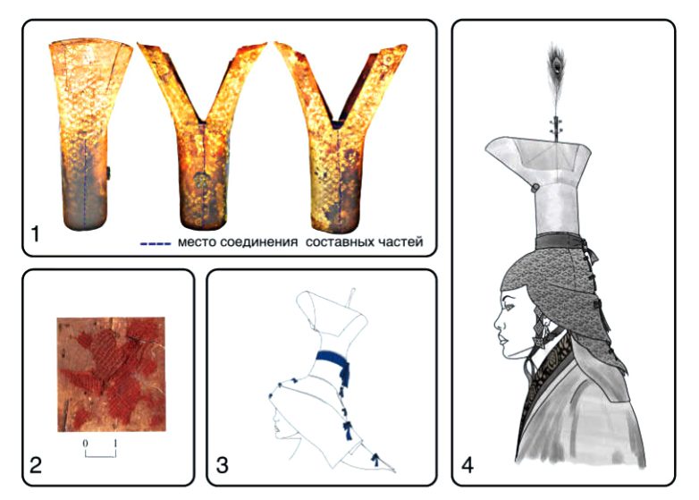 Остальные детали конструкции «красноярского» головного убора можно только восстанавливать по аналогиям. Каркас обтягивался двумя слоями ткани. На крышке «капители» сохранились небольшие фрагменты верхней обтяжки – это кусочки тонкого красного шёлка. На голове боктаг крепился с помощью лент, к нижнему краю ствола и его задней части крепили тканевую «фату» или «уши». Обычно головной убор украшали разными нашивками, но, как уже говорилось, в погребении был только один похожий предмет. Так что либо остальные нашивки не сохранились (их могли сделать из органических материалов), либо оказались полностью утрачены при разрушении погребения. Обязательным элементом боктага было деревянное навершие, в которое вставлялись перья. Завершался образ шапочками – нижней и верхней.