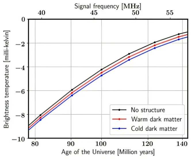 Команда обнаружила, что усредненная по небу мощность этого древнего сигнала зависит от того, является ли темная материя теплой или холодной. Различие между сценариями составляет менее милликельвина по яркостной температуре.