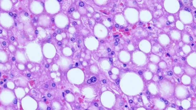 Гистологическое изображение жирной печени человека с большими белыми липидными частицами /newsnetwork.mayoclinic.org/