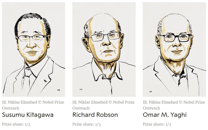 Нобелевские лауреаты по химии 2025: Сусуму Китагава, Университет Киото, Япония, Ричард Робсон, Мельбурнский университет, Австралия, Омар М. Яги, Калифорнийский университет, Беркли, США. Они удосены премии «за разработку металлоорганических каркасов».