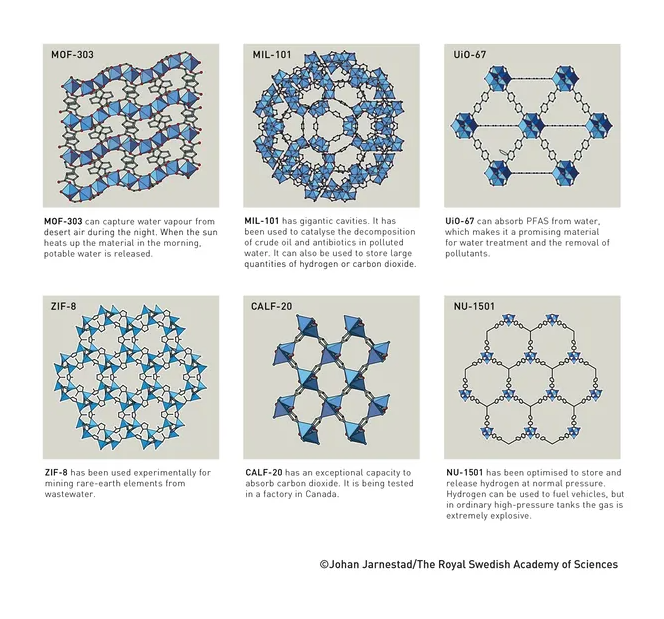 В начале 2000-х годов Яги показал, что можно создавать целые семейства металлоорганических материалов. Он варьировал молекулярные связи, и в результате получались материалы с различными свойствами. К ним относятся 16 вариантов MOF-5 с полостями разного размера.Nobel PrizeСегодня разработаны десятки тысяч различных каркасов. Исследовательская группа Яги добывает питьевую воду из воздуха пустынь в Аризоне — ночью материал улавливает водяной пар, а утром под солнечными лучами отдает воду.