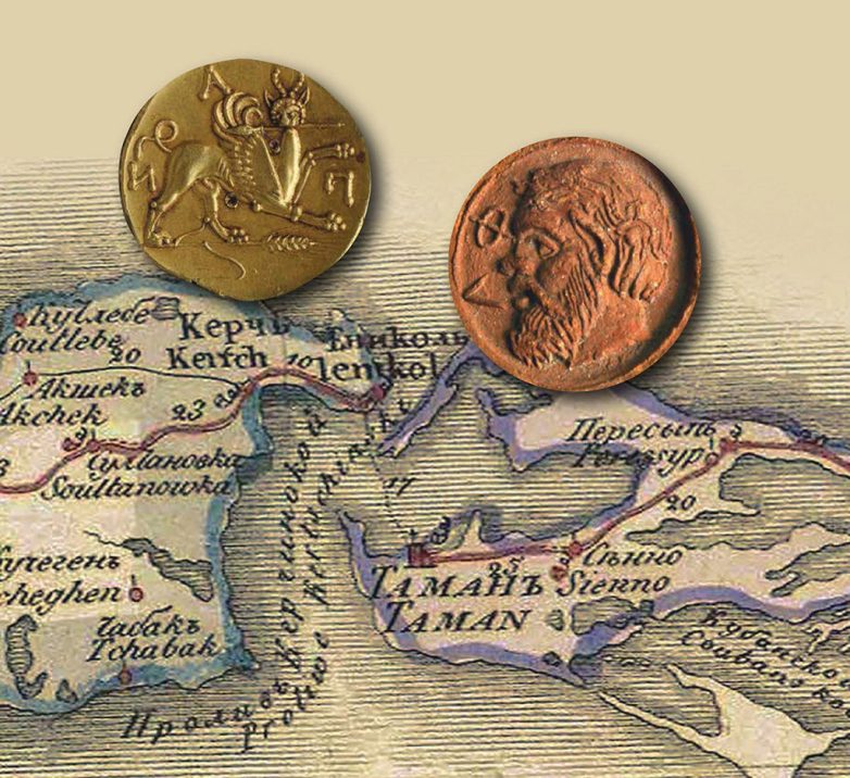 Пантикапейская монета (слева) и клеймо с первыми буквами названия «Фанагория» (справа). На заднем плане – часть карты Керченского и Таманского полуостровов. На ней обозначена Керчь, в которой находился Пантикапей, и посёлок Сенной – не его окраине лежат остатки Фанагории.