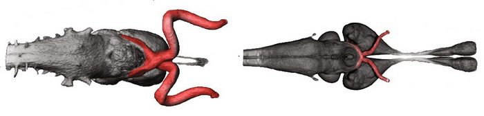 В недавней статье в Scientific Reports описаны результаты компьютерной томографии йеменского хамелеона, мадагаскарского Brookesia superciliaris, и африканского Rieppeleon brevicaudatus. У всех зрительные нервы оказались с запасом: та часть нерва, которая подходит к глазу, образует спиральную петлю или полупетлю – избыток в длине нерва у разных видов может отличаться, но, так или иначе, он есть. Исследователи также проследили за развитием зрительного нерва. На ранних эмбриональных стадиях он у хамелеонов идёт по прямой от глаза до перекреста (как известно, волокна зрительных нервов от левого и правого глаза частично перекрещиваются в основании мозга). Но потом нервы начинают удлиняться, и новорождённые хамелеоны появляются на свет со зрительными нервами, как бы провисающими в спираль.