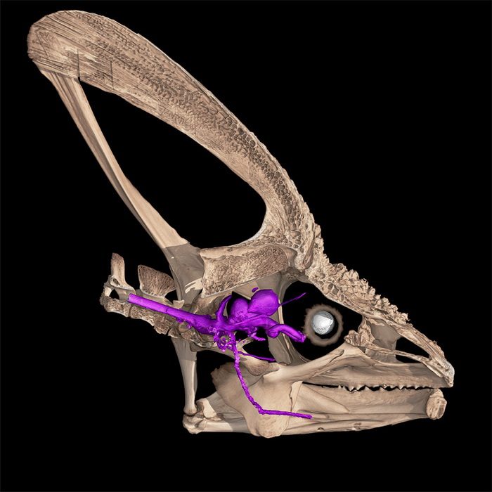 Результаты компьютерной томографии центральной нервной системы хамелеона; виден изгиб зрительного нерва, идущего от глаза. (Иллюстрация: Collins et al., Scientific Reports, 2025)
