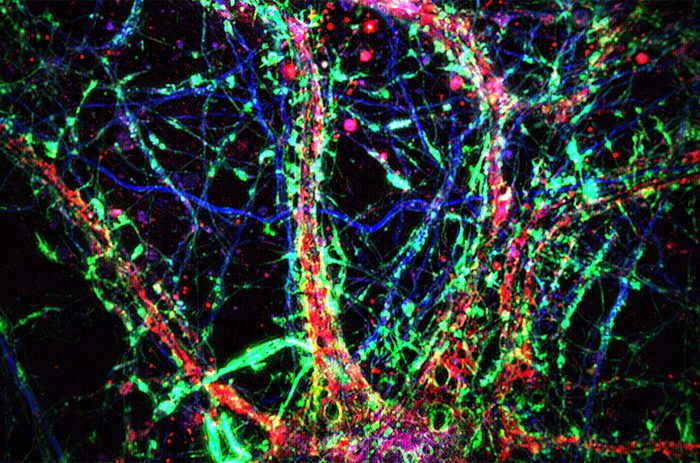 Микрофотография нейронов, у которых отростки и телка клеток окрашены синим и красным, а дендритные нанотрубки – зелёным. (Фото: Minhyeok Chang et al., Science, 2025)