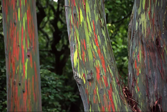 Eucalyptus deglupta выглядит как живое произведение искусства. Это дерево естественно произрастает в Филиппинах, Индонезии и Папуа-Новой Гвинее и является единственным видом эвкалипта, который встречается в дикой природе северного полушария. Он может вырастать до 78 метров в высоту и до 2,4 метра в ширину и сохраняет свою листву круглый год. Кроме того, в отличие от других видов, радужный эвкалипт не выделяет ароматное масло и используют его в основном для производства целлюлозы.
